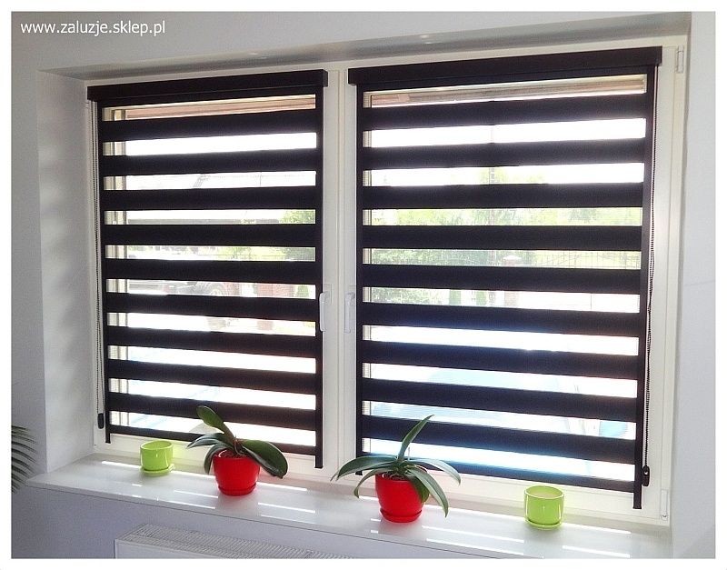 Czarne rolety dzień noc w czarnej kasecie z prowadnicami. Rolety okienne dostępne w naszej ofercie to między innymi uniwersalne, praktyczne, widoczne na zdjęciu rolety duo – świetnie sprawdzają się między innymi w pokojach dziennych, ale też w kuchniach czy pokojach. Możesz wybrać takie rolety w wielu kolorach, które świetnie pasują do każdego wnętrza, jak uniwersalne beże czy ciemne brązy i bordo.