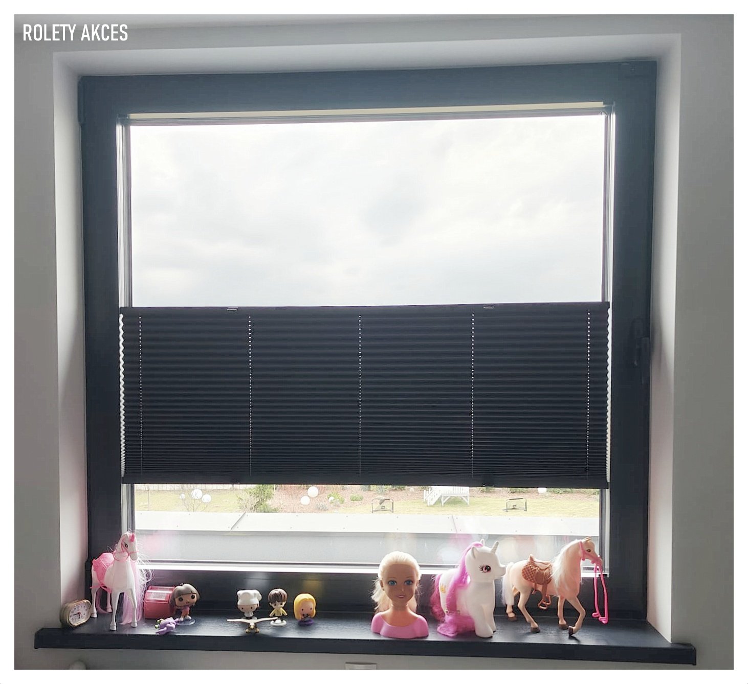 Nasza najnowsza realizacja to antracytowe rolety plisowane, które stanowią doskonałe dopełnienie nowoczesnych wnętrz z ciemną stolarką okienną. Zastosowany system sterowania góra dół pozwala na niezwykle precyzyjne ustawienie poziomu osłonięcia, co jest kluczowe w pokojach dziecięcych podczas zabawy czy odpoczynku. Ciemny kolor tkaniny o strukturze drobnej harmonijki nie tylko wygląda prestiżowo, ale również skutecznie rozprasza ostre światło, tworząc w pomieszczeniu komfortowe warunki o każdej porze dnia.
