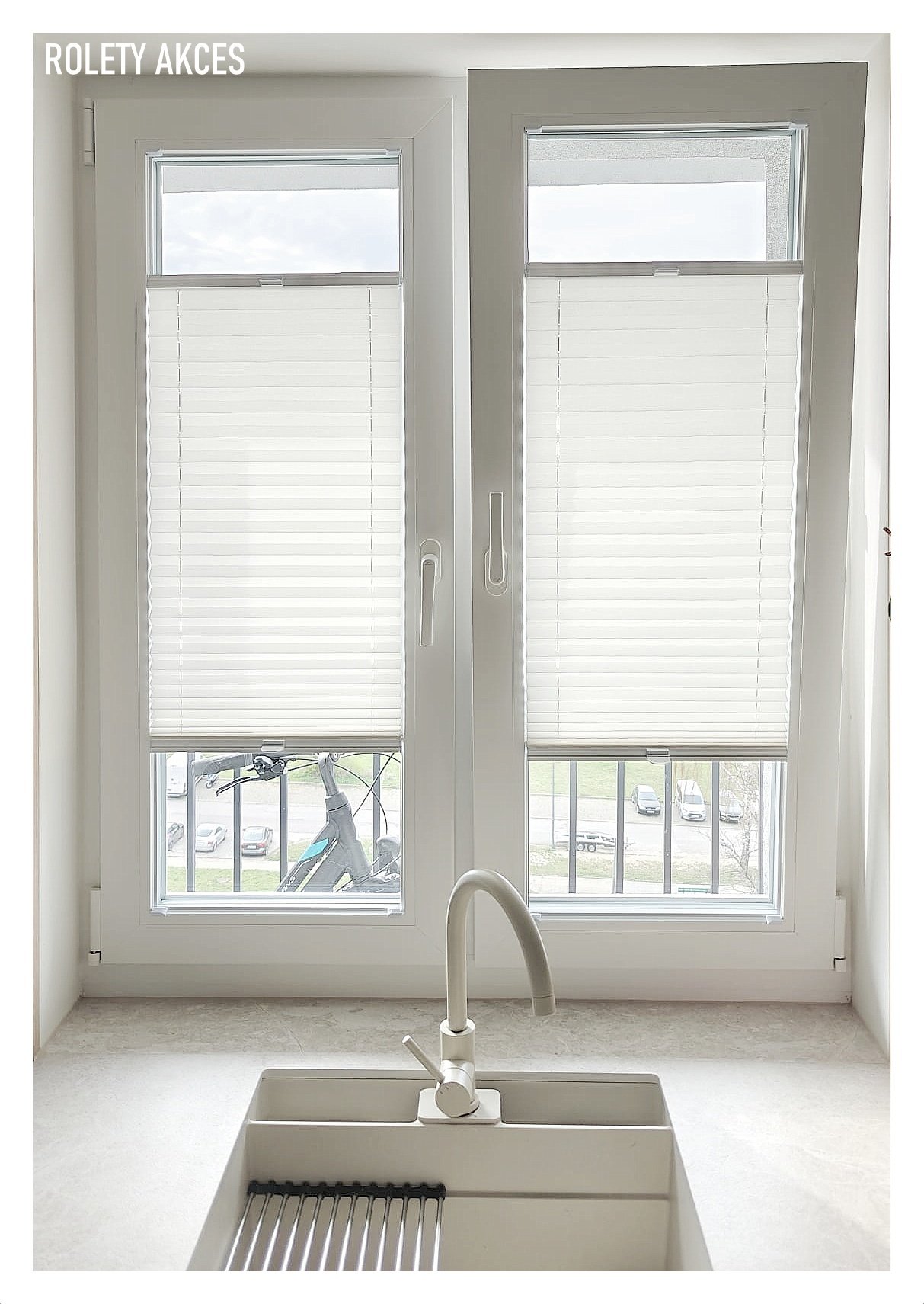 Wybór plis w tym miejscu to strzał w dziesiątkę, ponieważ system montażu w świetle szyby nie ogranicza dostępu do baterii kuchennej i pozwala na swobodne otwieranie okna. Biała tkanina o strukturze harmonijki świetnie komponuje się z jasną zabudową i armaturą, tworząc spójną i niezwykle sterylną estetycznie przestrzeń. To rozwiązanie łączy w sobie elegancję z niezwykłą praktycznością, niezbędną w sercu każdego domu.