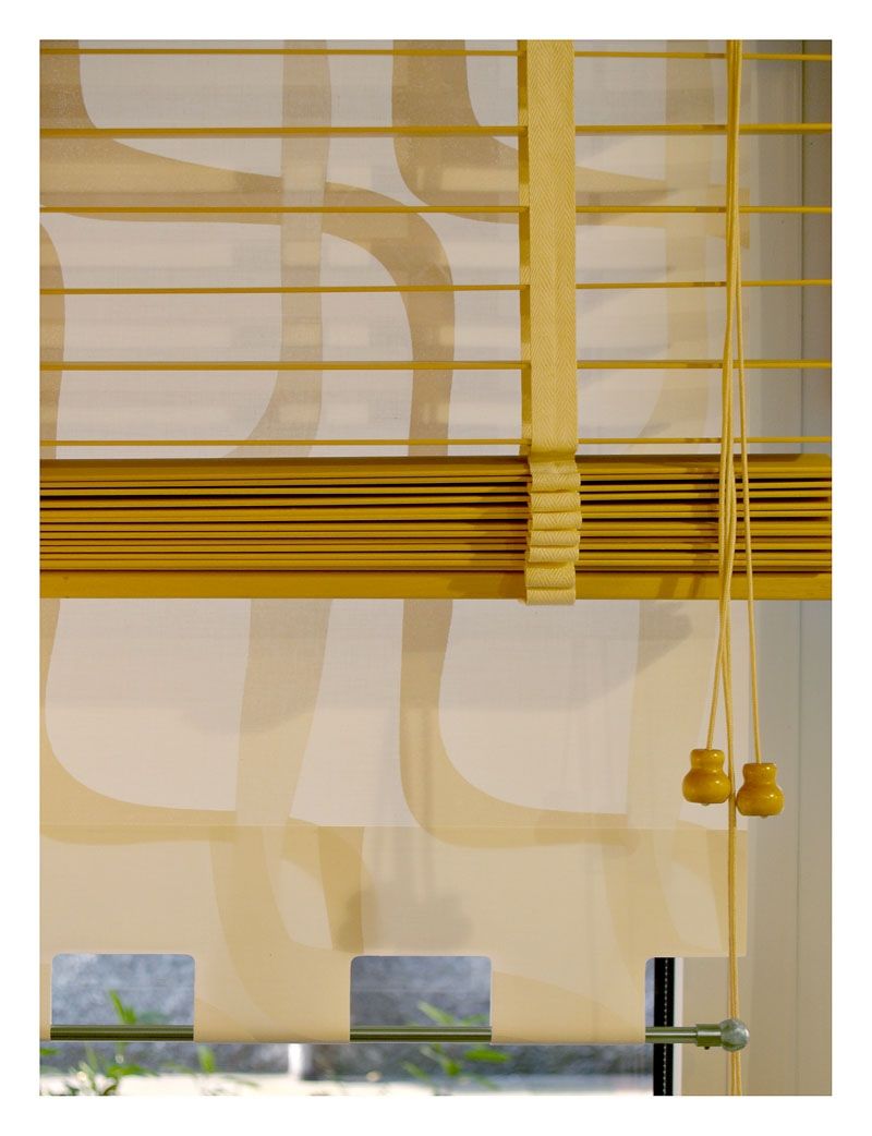 Żaluzja drewniana na tle rolety materiałowej z ozdobnym wykończeniem dolnym