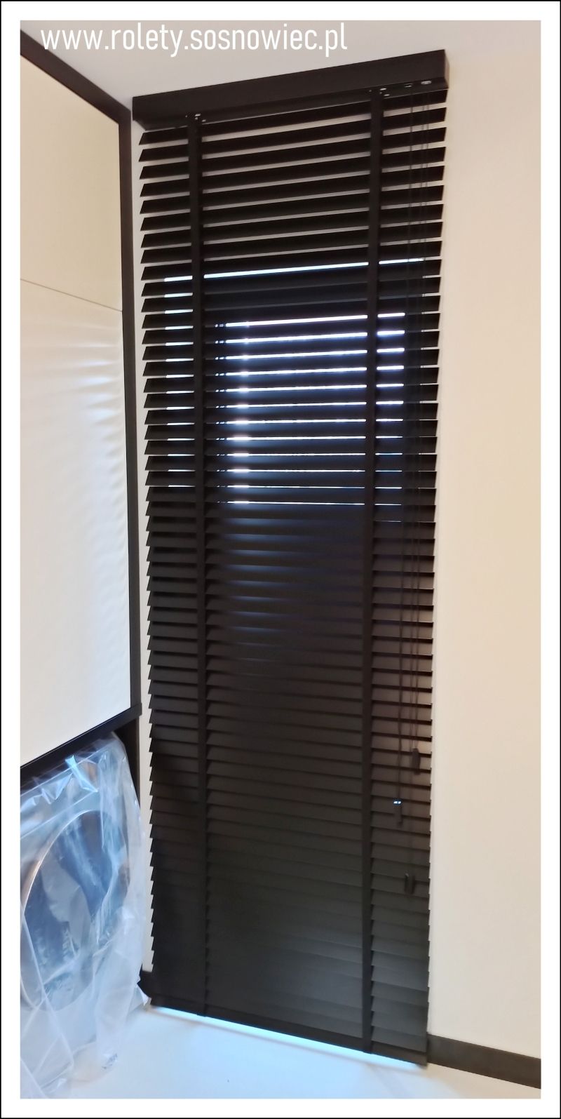 Ciemne żaluzje aluminiowe optycznie podkreślają geometrię wnętrza i nadają mu nowoczesnego charakteru.