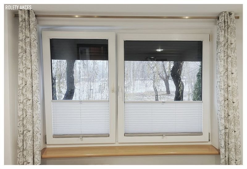 Biała stolarka i jasna tkanina plis harmonijnie współgrają z naturalnym parapetem i wzorzystymi zasłonami, tworząc przytulną, spójną aranżację idealną do salonu lub jadalni.
