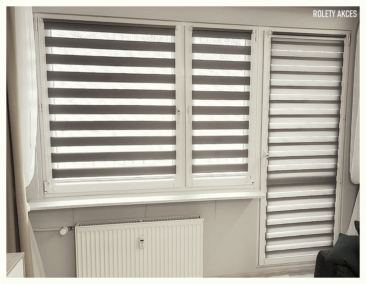 Rolety dzień-noc w kolorze szarym, zamontowane na potrójnym oknie w wykuszu. Funkcjonalne i nowoczesne rozwiązanie zapewniające komfort i kontrolę światła.