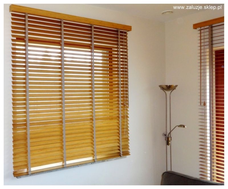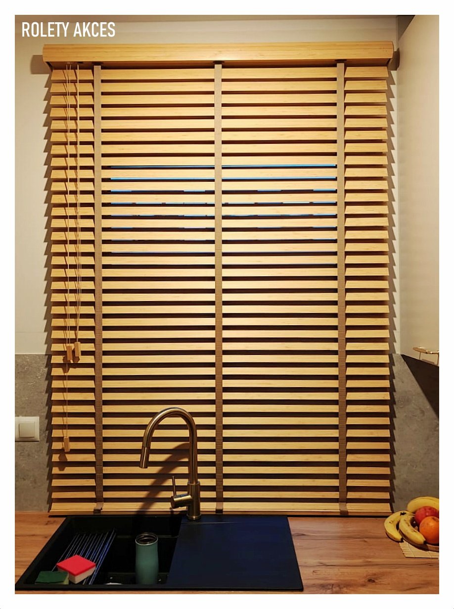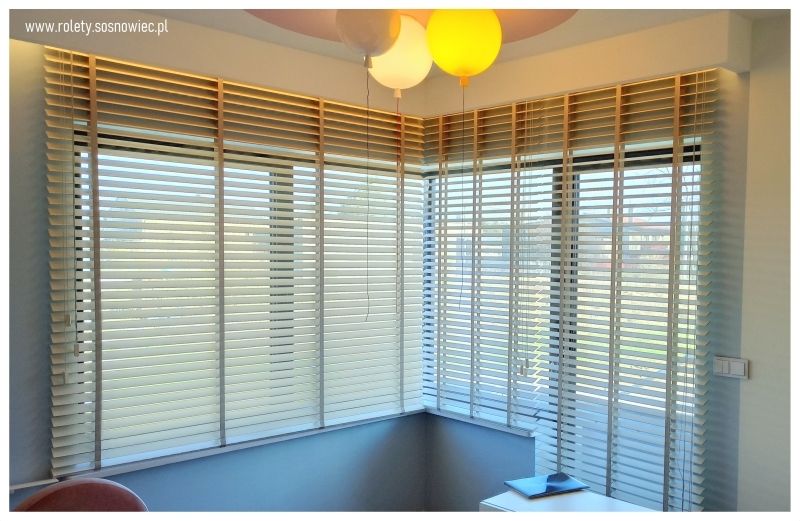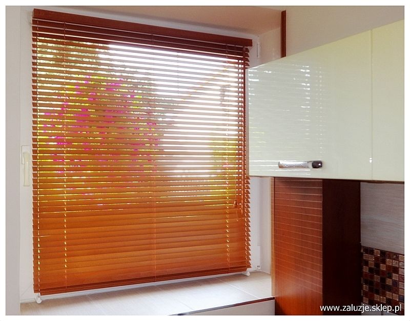 żaluzje drewniane 50mm, żaluzje na taśmach, żaluzje drewniane do jadalni.