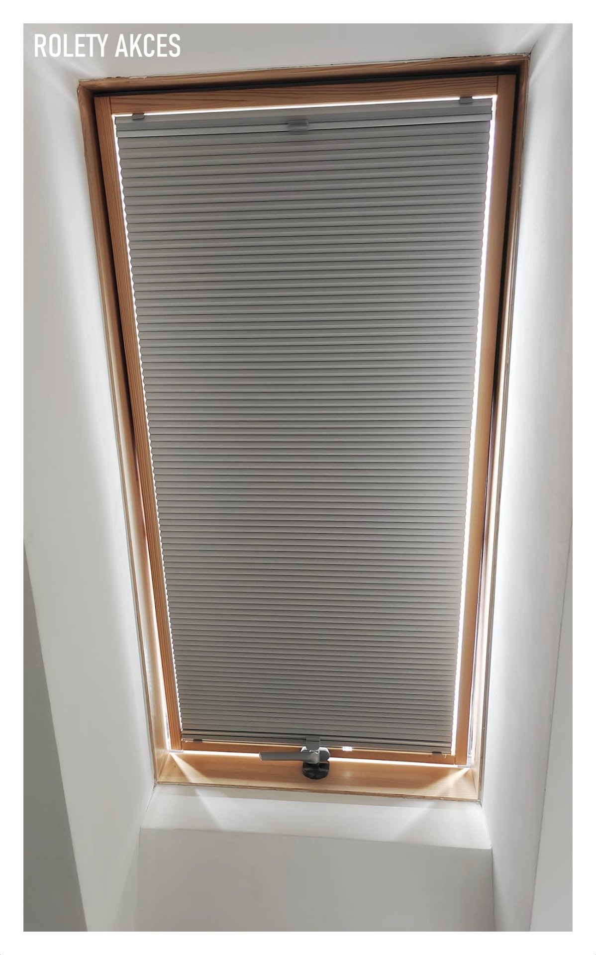 Nowoczesna plisa dachowa Akces w kolorze popielatym, idealnie dopasowana do drewnianej ramy.