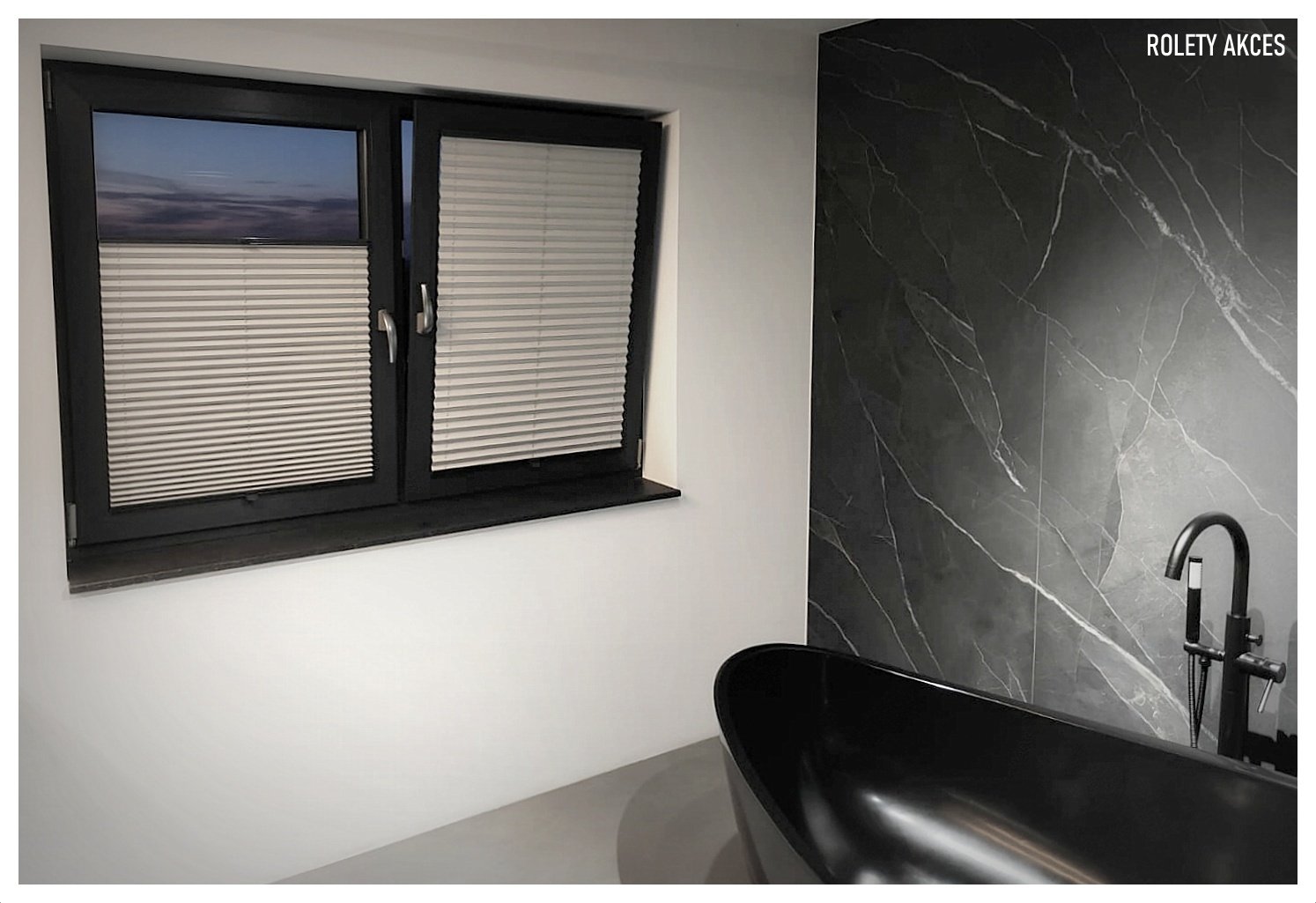 Postaw na intymność w łazience z Rolety Akces. Nasze jasne plisy świetnie kontrastują z ciemną stolarką i czarną wanną.