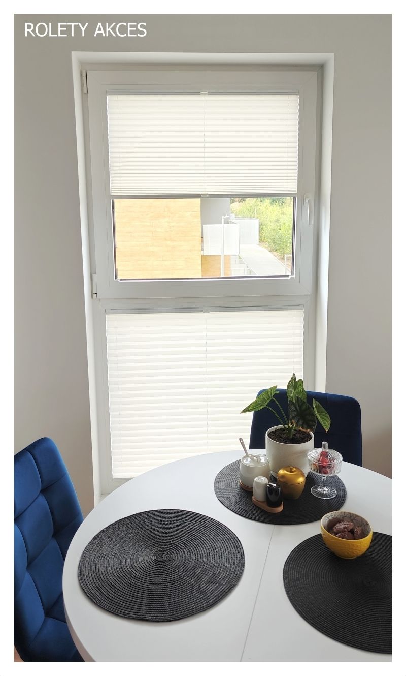 Biała plisa okienna – delikatna, funkcjonalna i pasująca do każdego wnętrza. Styl i komfort w jednym, z możliwością regulacji światła przez cały dzień.