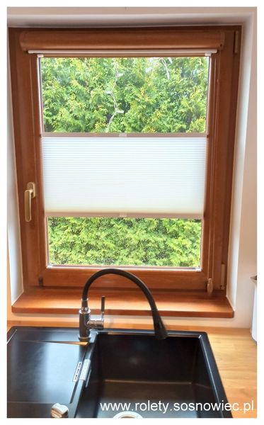 Na zdjęciu widoczne są plisy okienne dopasowane do okien w eleganckiej okleinie orzech. Kolor plis idealnie komponuje się z ciepłą tonacją drewna, tworząc spójną i estetyczną całość. Plisy umożliwiają...